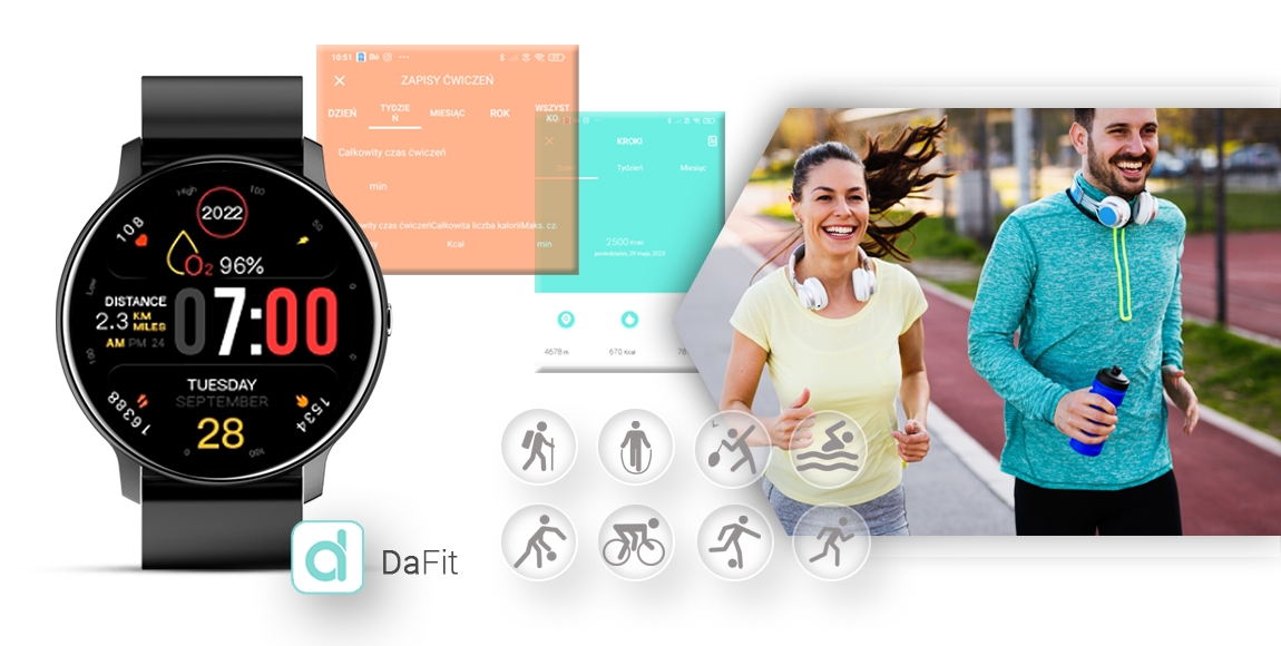 - Tryby sportowe: bieganie, jazda na rowerze, spacer, fitness